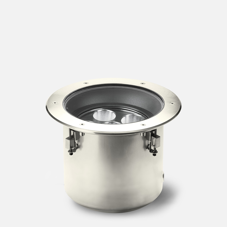In-grade adjustable floodlight luminaires. The patented mounting system allows for installation in pre-cored holes such as stone, tile or decks. These luminaires are designed to bear pressure loads up to 4400 lbs. from vehicles with pneumatic tires. The luminaires must not be used for traffic lanes where they are subject to horizontal pressure from vehicles braking, accelerating and changing direction. The inclination angle is adjustable from 0-30° in 3° increments, and the optical assembly can be rotated 180° around the vertical axis.