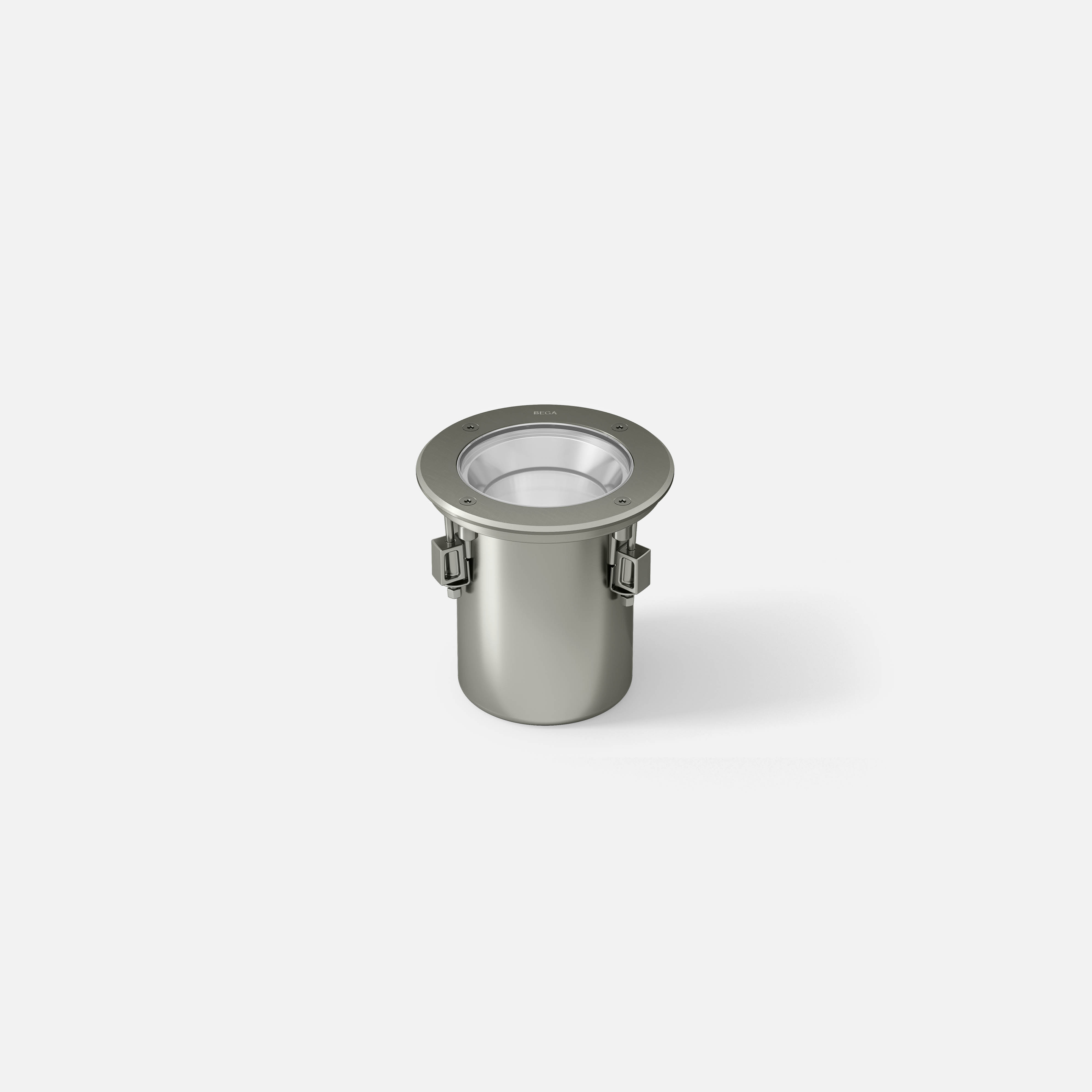 A round in-grade intended for the illumination of walls, foliage, and architectural features mounted in pre-cored holes such as stone, tile or decks. Designed to bear pressure loads up to 4,400 lbs. from vehicles with pneumatic tires. The luminaires must not be used for traffic lanes where they are subject to horizontal pressure from vehicles braking, accelerating and changing direction.