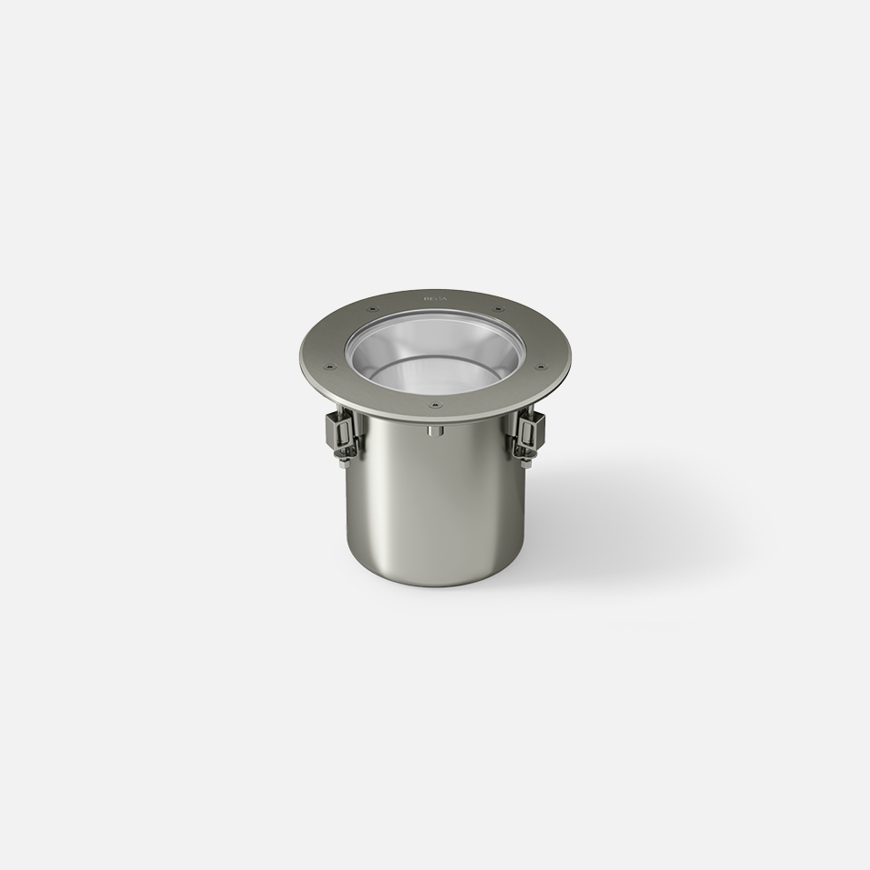 A round in-grade intended for the illumination of walls, foliage, and architectural features mounted in pre-cored holes such as stone, tile or decks. Designed to bear pressure loads up to 4,400 lbs. from vehicles with pneumatic tires. The luminaires must not be used for traffic lanes where they are subject to horizontal pressure from vehicles braking, accelerating and changing direction.