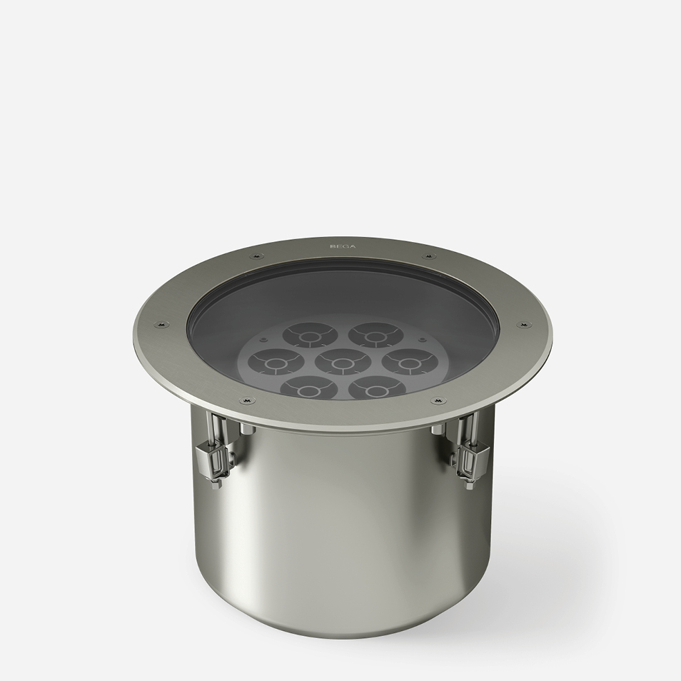 A round in-grade intended for the illumination of walls, foliage, and architectural features mounted in pre-cored holes such as stone, tile or decks. Designed to bear pressure loads up to 4,400 lbs. from vehicles with pneumatic tires. The luminaires must not be used for traffic lanes where they are subject to horizontal pressure from vehicles braking, accelerating and changing direction.
