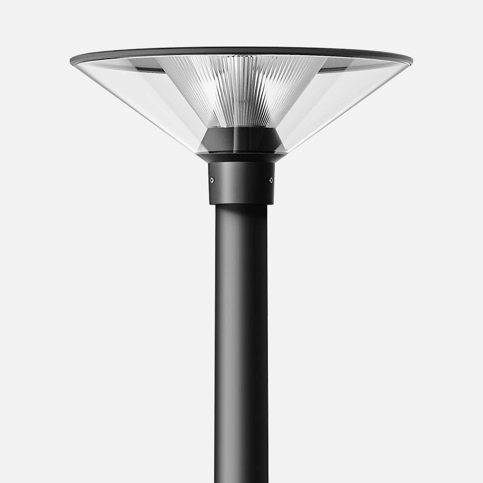 Pole-top luminaire with symmetric light distribution and shallow height. The symmetric light distribution is ideal for illuminating squares, plazas and other open areas.