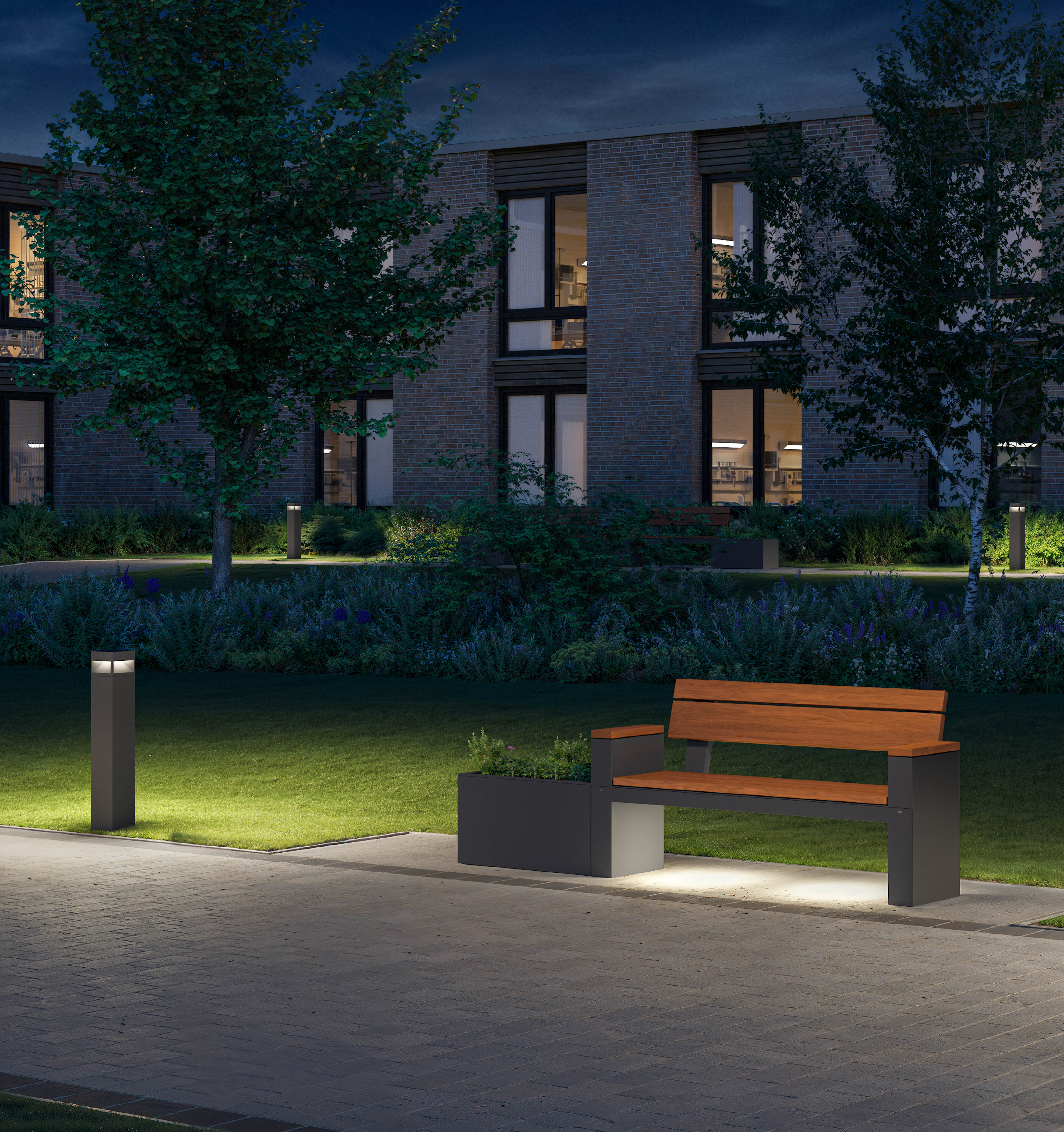 Designed to balance form and function, this bench with an integrated planter brings nature within reach. The introduction of wood helps designers soften the built environment. Available with integral illumination.