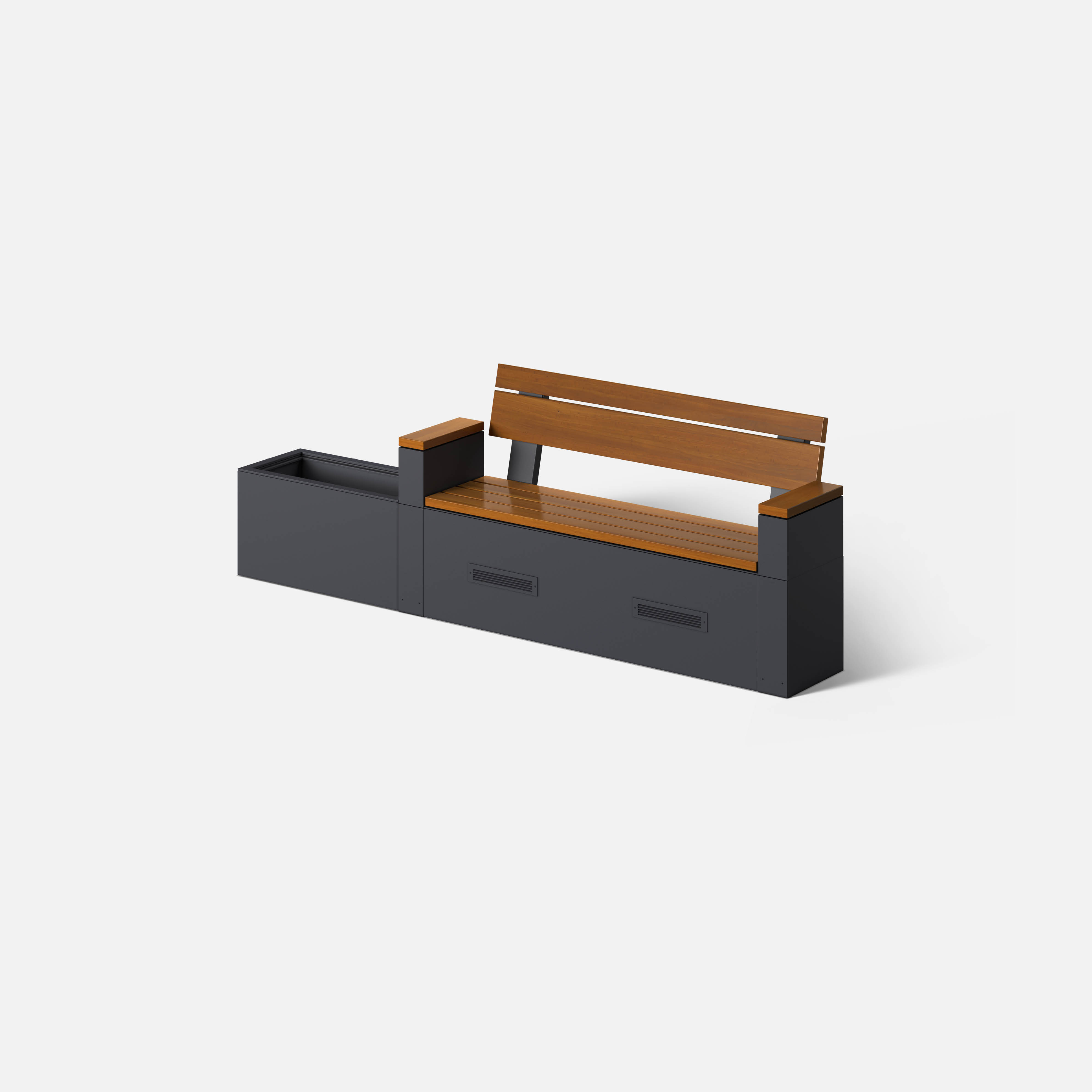 Designed to balance form and function, this bench with an integrated planter brings nature within reach. Integral illumination casts a warm glow that enhances material warmth and invites comfort. The introduction of wood helps designers soften the built environment.