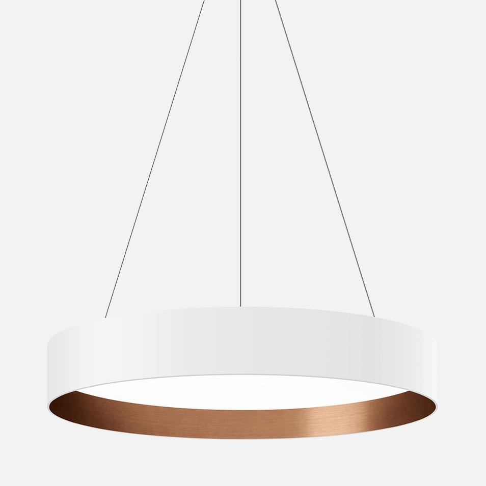 A large scale STUDIO LINE pendant. Its unique beauty and versatility is enhanced by the choice of three matte interior finishes combined with a white exterior. These finishes may be chosen to complement a wide array of interior spaces. A subtle hint of colored light on the outside edge of the beam spread results from the internally reflected light. The result is an eye-catching and elegant lighting effect.